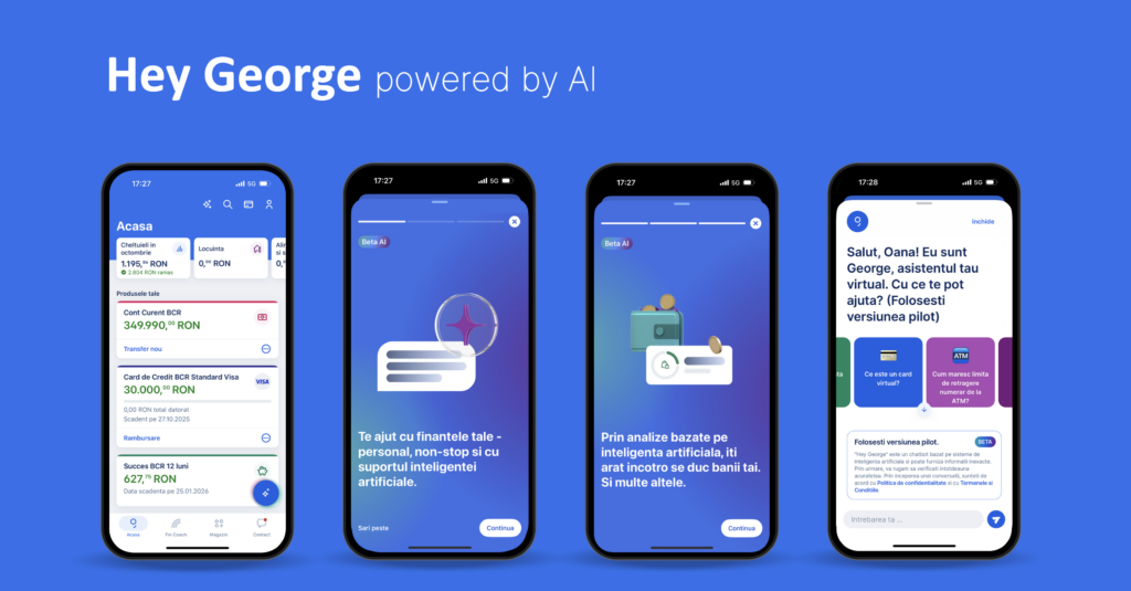 Unul dintre cele mai relevante momente ale prezentării este introducerea Hey George, un asistent financiar bazat pe tehnologie de tip GPT, dar gândit ca un partener care înțelege contextul, nu doar întrebarea.